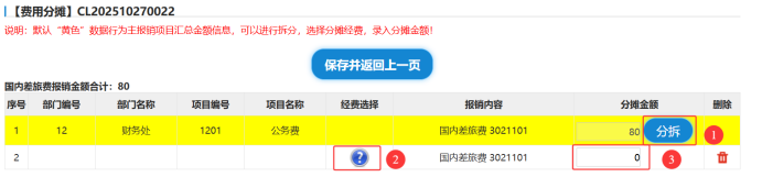 3.差旅费报销可实现“多项目分摊”功能,可在多个预算项目进行差旅费用的列支。分摊时需要点击“分拆”按钮,然后在下一行的经费选择处选择其他的预算项目,填写分摊金额后保存即可。
