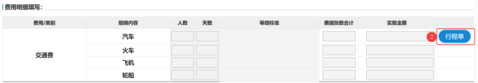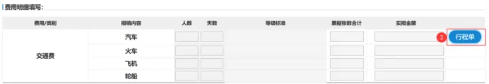 2.费用明细填写中新增“行程单”,请在行程单中录入详细的行程信息,系统会自动生成交通费金额。